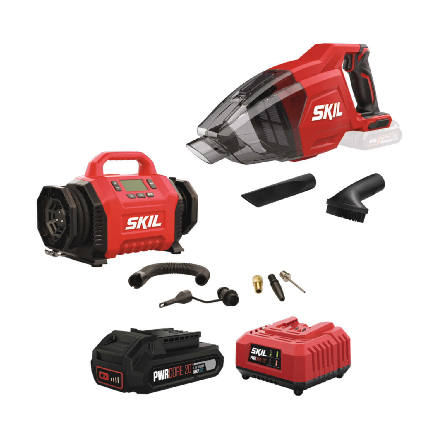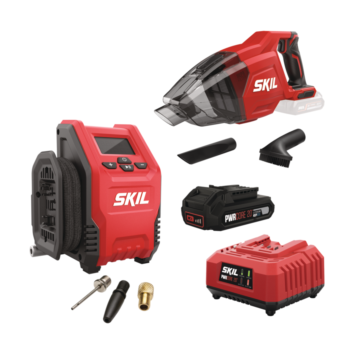 Σετ φορητών εργαλείων Skil που περιλαμβάνει αεροσυμπιεστή μπαταρίας και επαναφορτιζόμενο σκουπάκι χειρός 20V, μαζί με μπαταρία και φορτιστή. Ιδανικό για γρήγορες εργασίες, φουσκώματα και καθαρισμούς σε εξωτερικούς ή μικρούς εσωτερικούς χώρους λόγω φορητότητας και εύκολου χειρισμού.