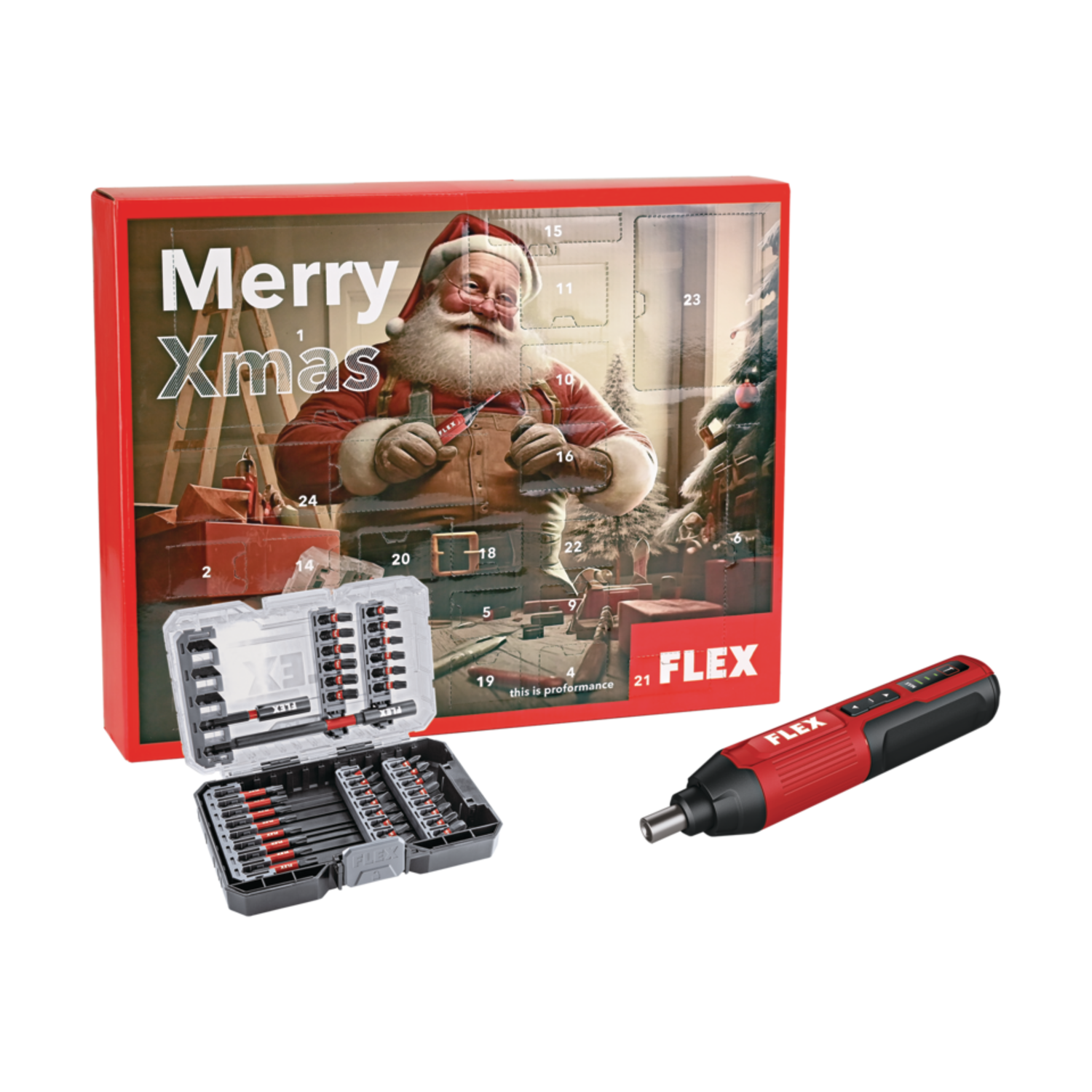 Πρόκειται για ένα ασύρματο/επαναφορτιζόμενο κατσαβίδι (Flex SD 5-300 4.0) με ενσωματωμένη μπαταρία, κατάλληλο για απλές DIY εργασίες και συναρμολόγηση επίπλων. Εδώ εμφανίζεται μέσα σε χριστουγεννιάτικο ημερολόγιο ως δώρο/σετ, αλλά το ίδιο το αντικείμενο είναι ηλεκτρικό κατσαβίδι μπαταρίας.