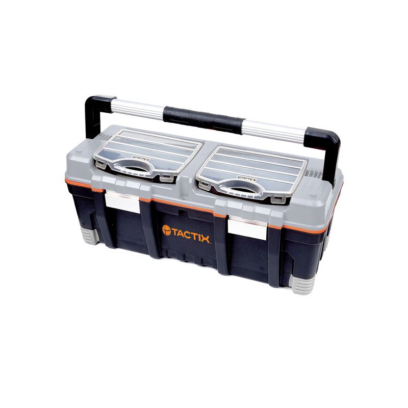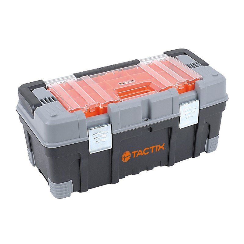 Φορητή εργαλειοθήκη TACTIX 22'' (56x28x25 cm) με εσωτερικό ράφι και ενσωματωμένη ταμπακιέρα, κλείσιμο με αλουμινένιο κλιπ. Ιδανική για οργάνωση και ασφαλή μεταφορά εργαλείων.