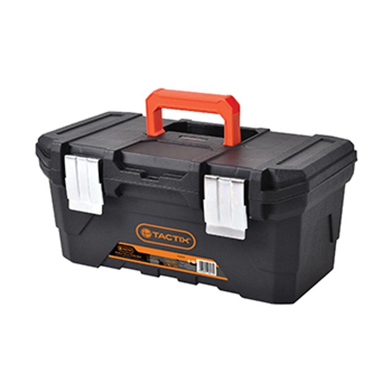 Πλαστική εργαλειοθήκη TACTIX 16.5" (περίπου 42.5×33.5×21 cm) με αποσπώμενο ράφι/εσωτερικό ταψί και ενσωματωμένες θήκες. Σχεδιασμένη για οργάνωση, αποθήκευση και μεταφορά ηλεκτρικών εργαλείων με μεταλλικά κλιπ/κουμπώματα.