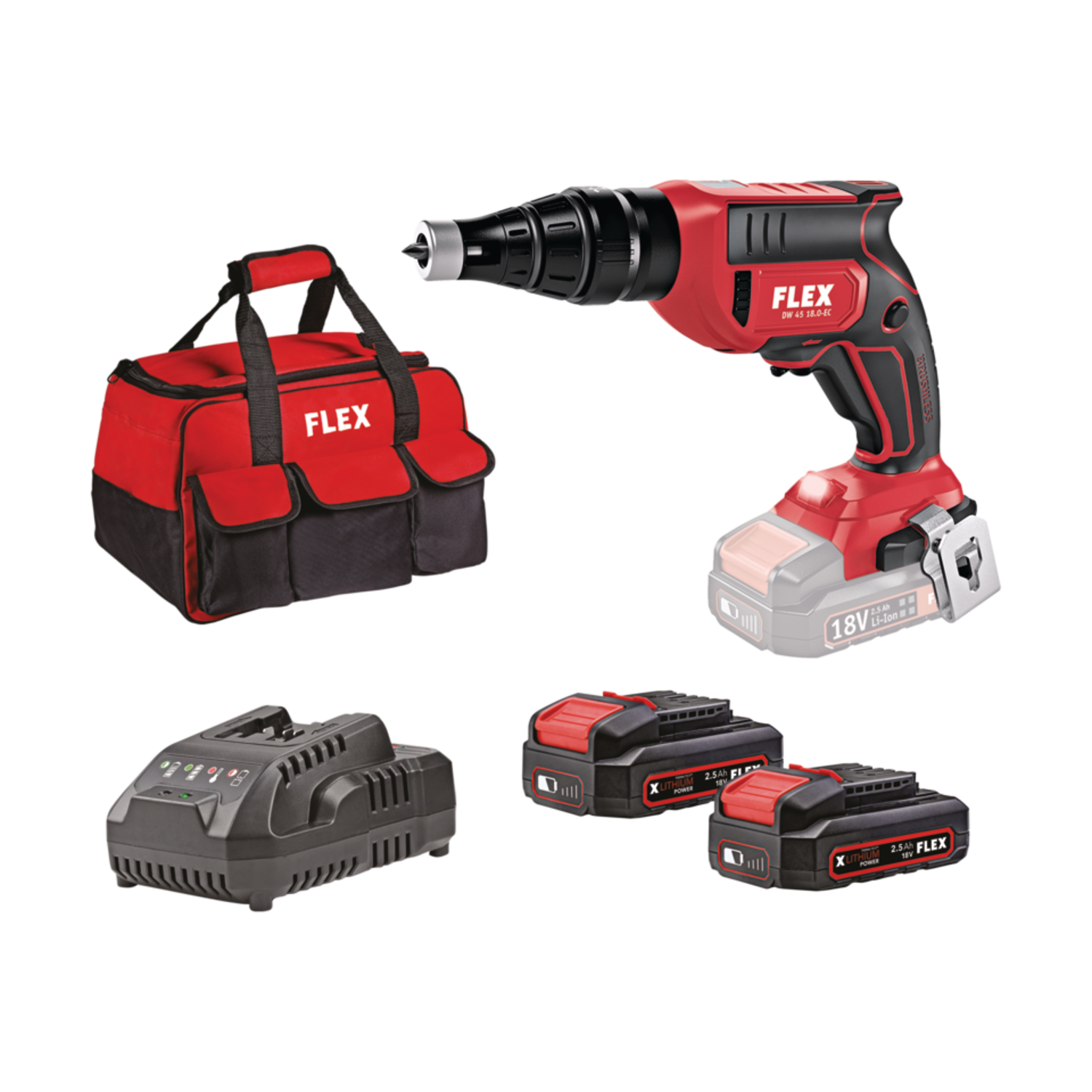 Ασύρματο (18V) κατσαβίδι γυψοσανίδας DW 45 18.0-EC σε σετ με δύο μπαταρίες 2,5Ah και ταχυφορτιστή. Σχεδιασμένο για γρήγορη και αξιόπιστη βιδωτική εργασία σε γυψοσανίδα, με brushless κινητήρα και ρυθμιζόμενο βάθος.