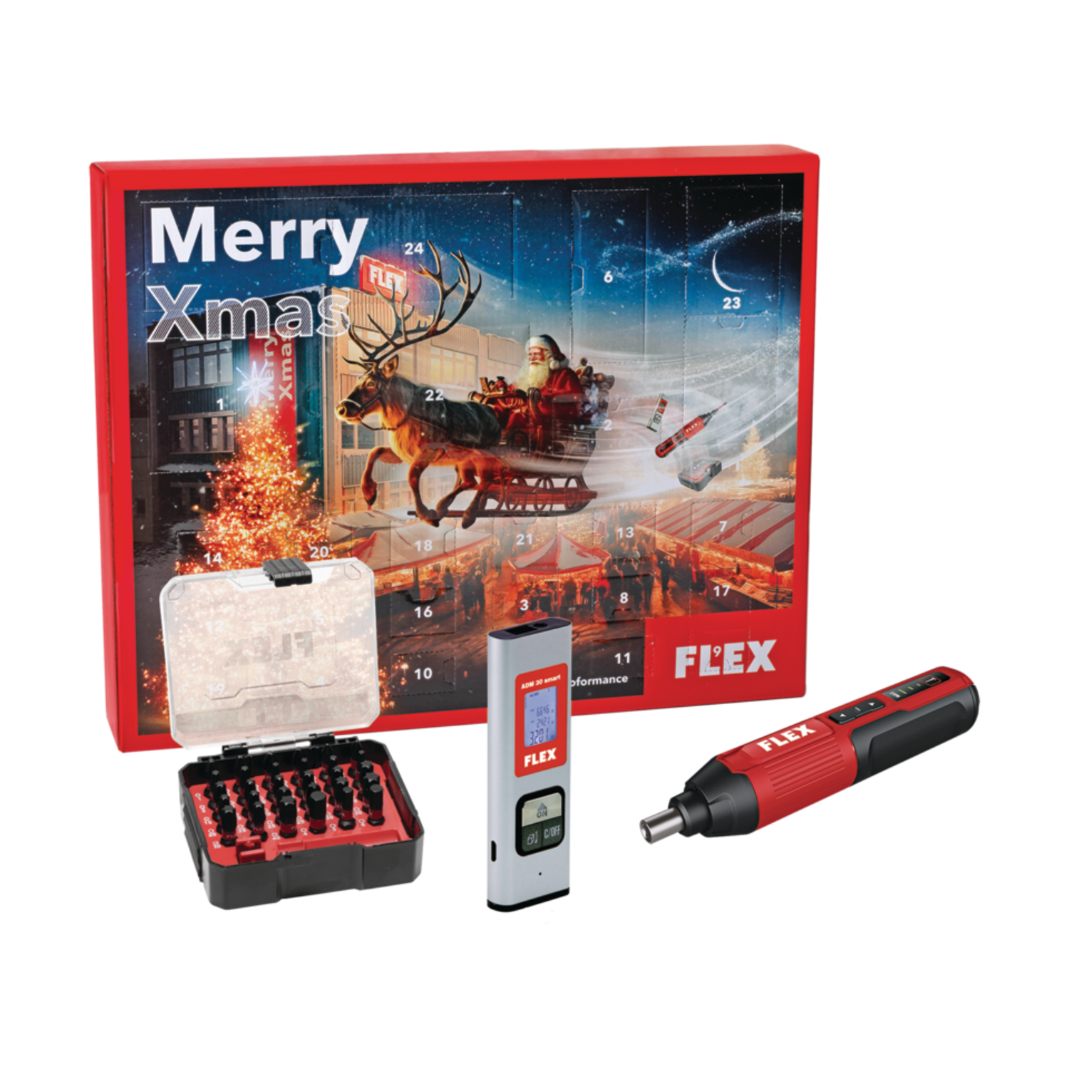 Πρόκειται για χριστουγεννιάτικο σετ/ημερολόγιο που περιέχει ένα κατσαβίδι μπαταρίας Flex SD 5-300 4.0 και ένα αποστασιόμετρο laser Flex ADM 30 Smart — ιδανικό ως δώρο για επαγγελματίες και DIY. Το κατσαβίδι είναι μικρό, φορητό και φορτίζεται μέσω USB-C· το αποστασιόμετρο μετρά έως ~30 μ. και έχει επαναφορτιζόμενη μπαταρία.