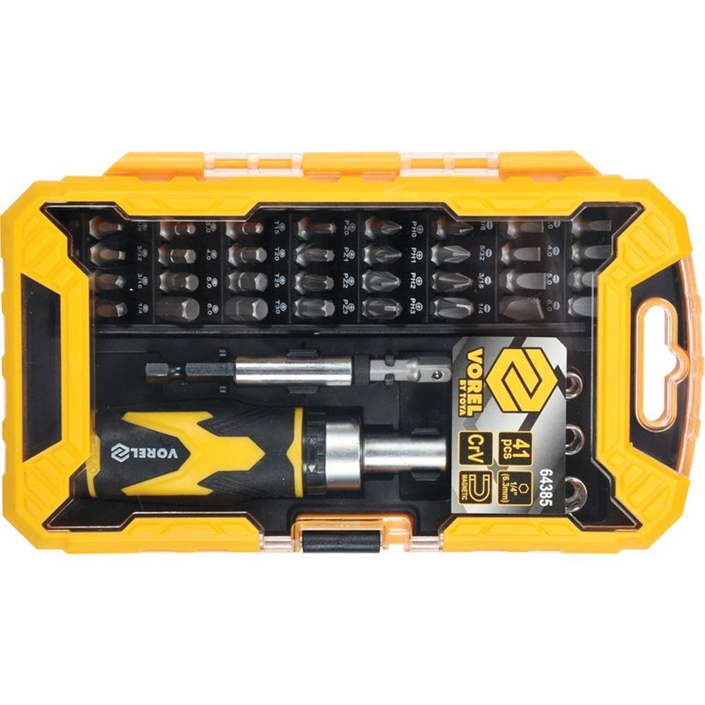 Συγκρότημα κατσαβιδιού καστανιάς VOREL 64385 με 41 τεμάχια μύτες. Ιδανικό για επαγγελματίες και ερασιτέχνες, προσφέρει ευελιξία και ακρίβεια στις εργασίες σας. Εξασφαλίζει άριστη πρόσφυση και ανθεκτικότητα χάρη στα ποιοτικά υλικά κατασκευής του.