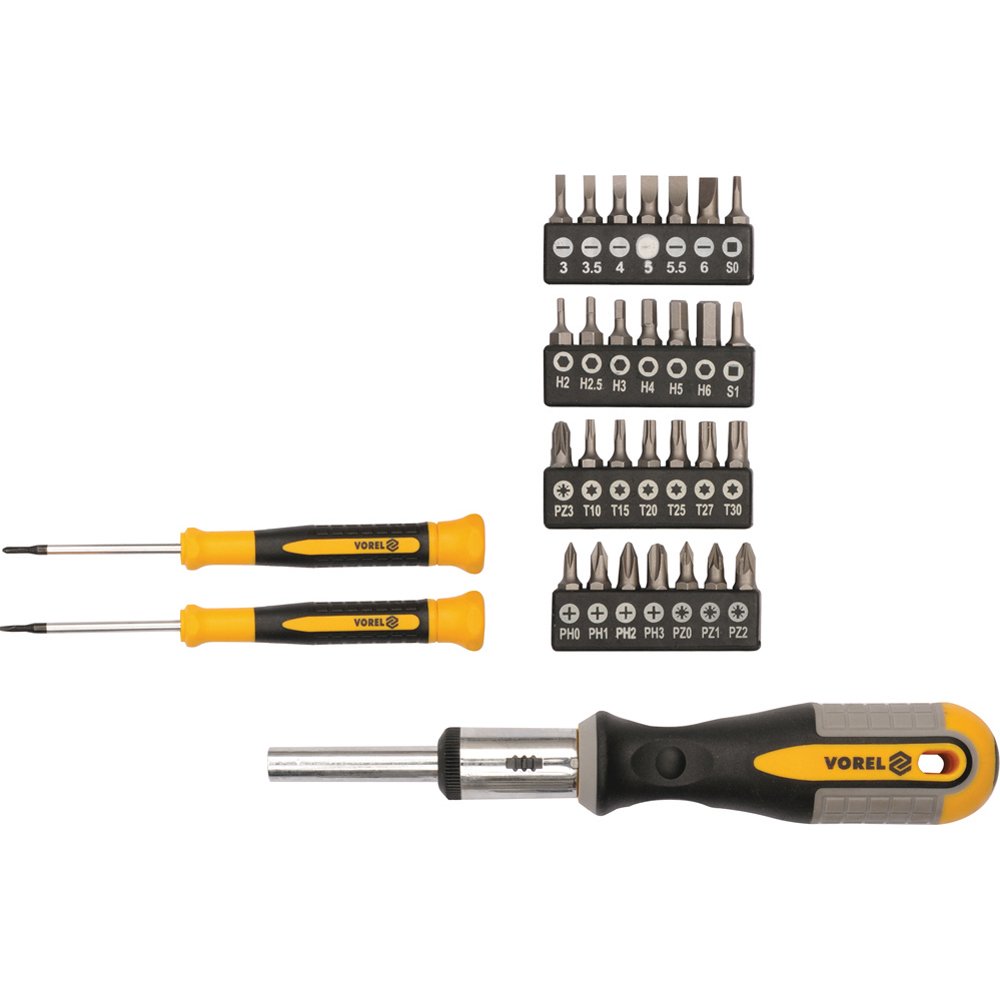 Σετ 31 τεμαχίων κατσαβιδιών καστανιάς VOREL 64655, ιδανικό για επαγγελματίες και ερασιτέχνες. Προσφέρει μεγάλη ποικιλία μύτης για όλες τις εργασίες. Υψηλή ποιότητα κατασκευής για μακροχρόνια χρήση.