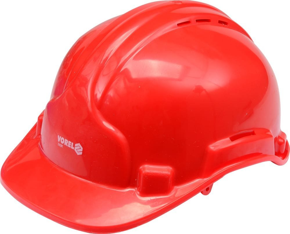 Κράνος προστασίας Vorel σε κόκκινο χρώμα για ασφαλή εργασία. Παρέχει ανθεκτική προστασία κεφαλής από χτυπήματα και πτώσεις, κατάλληλο για εργοτάξια και βιομηχανικούς χώρους.